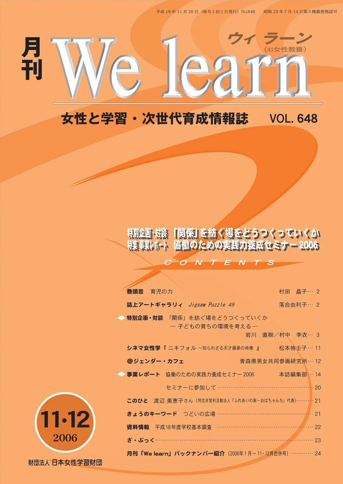 コーヒーブレイク:エッセイ家事能力は男の“甲斐性”/あいとゆうのデータトーク:自立度が低い!?日本の子どもたち/スポットれ・き・し:家庭科教育の歴史―女子のみ必修から男女共修へ/青森県男女共同参画研究所