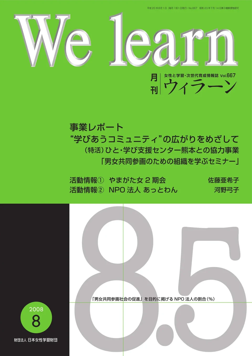 現代は、多様な分野、境遇、年代にある女性たちが、力をつけるための学習の必要を自覚し、自らの気づきや、より適切で有効な手法での学習を、日常の場でそれぞれが開拓する時代に入っていると思います。『We learn』はその営みを総称する合言葉となり、学びへのきっかけづくりや全国的な情報交換の場としてお使いいただけるように、との思いを込めました。