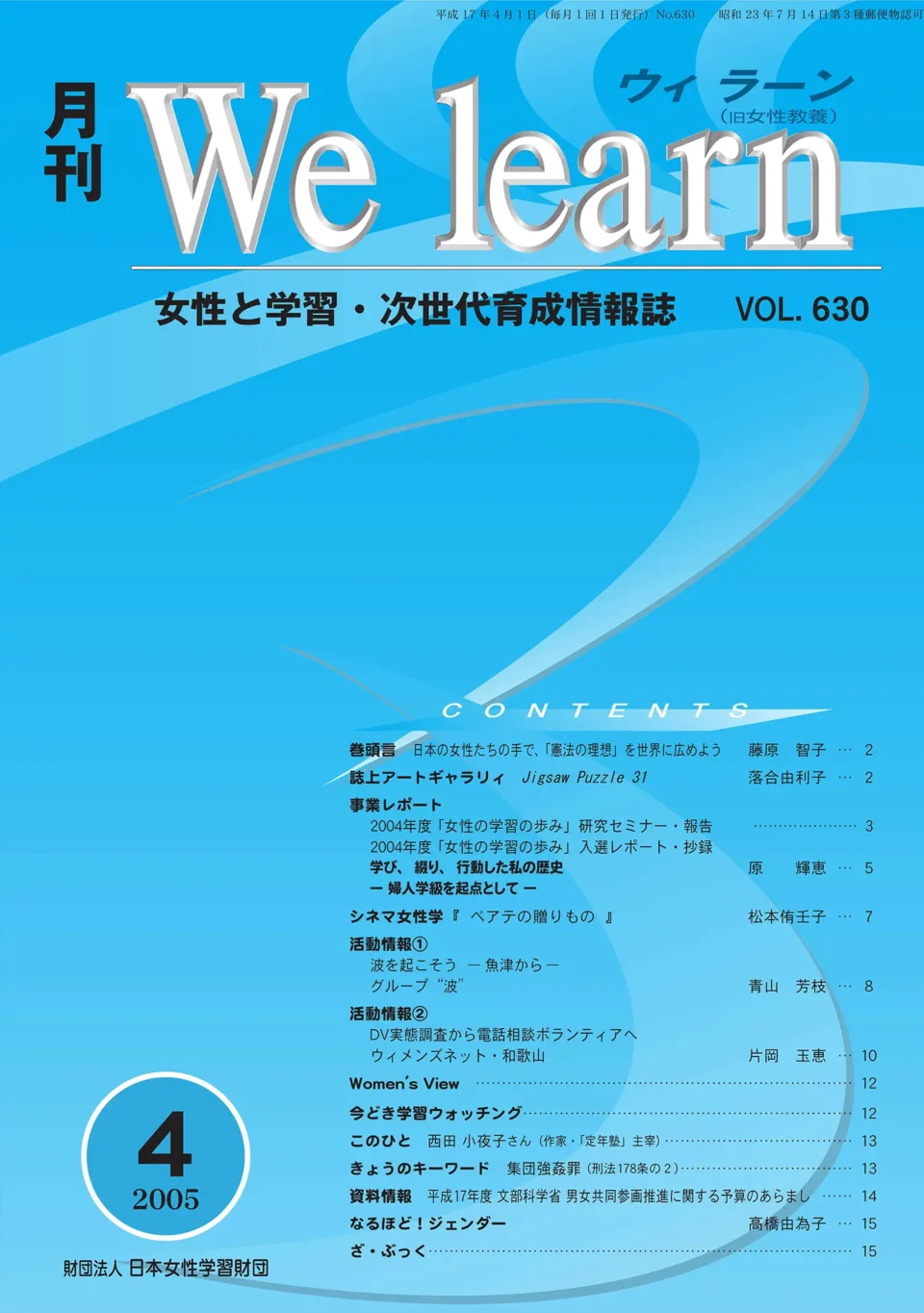 現代は、多様な分野、境遇、年代にある女性たちが、力をつけるための学習の必要を自覚し、自らの気づきや、より適切で有効な手法での学習を、日常の場でそれぞれが開拓する時代に入っていると思います。『We learn』はその営みを総称する合言葉となり、学びへのきっかけづくりや全国的な情報交換の場としてお使いいただけるように、との思いを込めました。