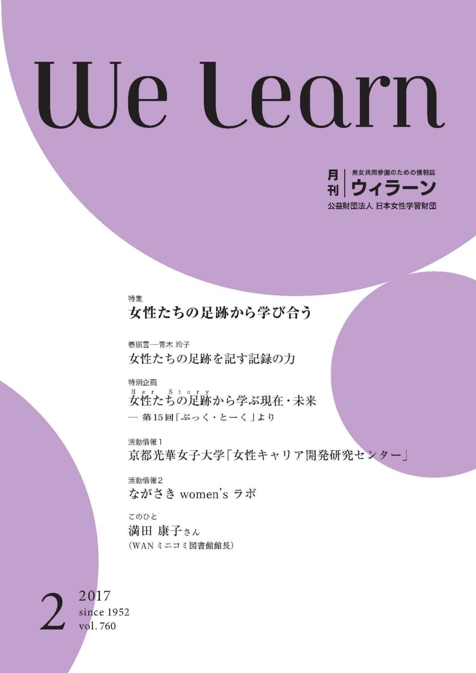 現代は、多様な分野、境遇、年代にある女性たちが、力をつけるための学習の必要を自覚し、自らの気づきや、より適切で有効な手法での学習を、日常の場でそれぞれが開拓する時代に入っていると思います。『We learn』はその営みを総称する合言葉となり、学びへのきっかけづくりや全国的な情報交換の場としてお使いいただけるように、との思いを込めました。